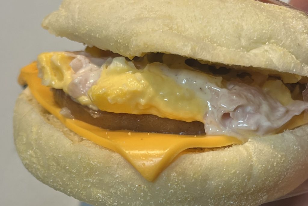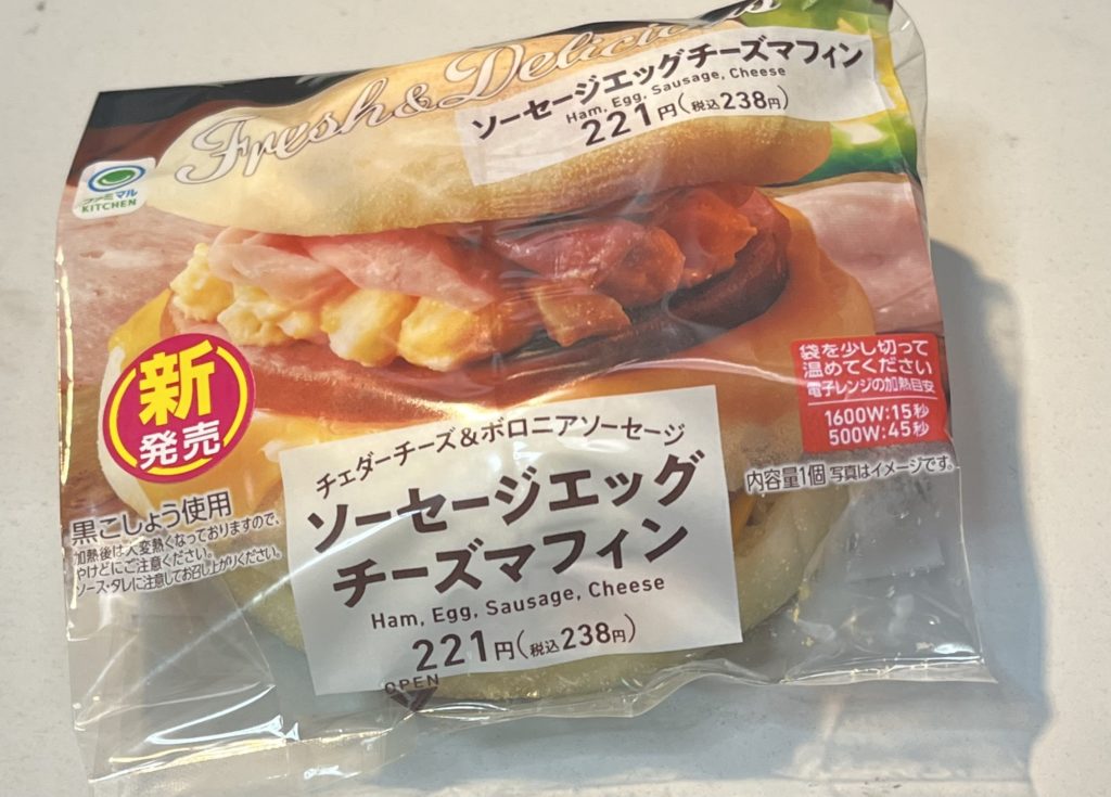 ●原材料名:パン(国内製造)、ソーセージ、卵サラダ、チーズ、ハムマヨソース和え、黒こしょう入りマヨソース/加工デンプン、調味料(有機酸等)、増粘剤(加工デンプン、増粘多糖類)、乳化剤、pH調整剤、酸味料、着色料(カロチノイド、クチナシ)、参加防止剤(V.C)、香辛料抽出物、焼成Ca、発色剤(亜硝酸Na)、V.C、レシチン、(一部に小麦・卵・乳成分・大豆・豚肉、りんごを含む)