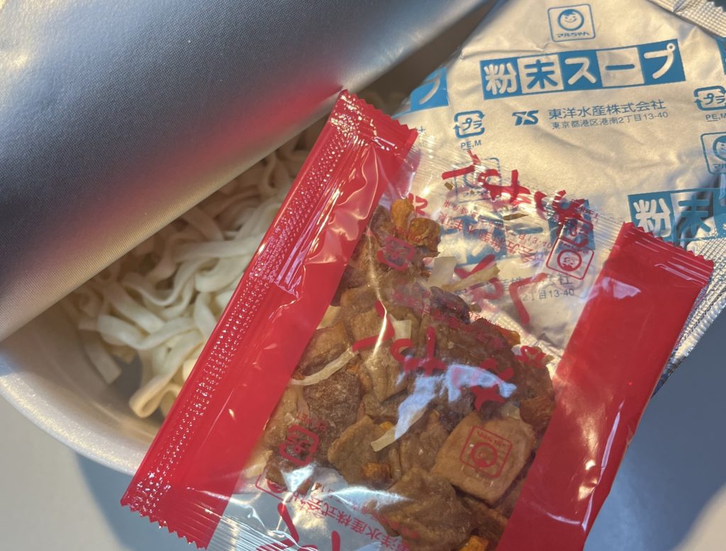 ●原材料名:油揚げめん(小麦粉(国内製造)、植物油脂、でん粉、食塩、植物性たん白、乾燥酵母、卵白)、添付調味料(食塩、香辛料、粉末野菜、砂糖、豚脂、デキストリン、ポークエキス、しょうゆ、魚介エキス、たん白加水分解物、ねぎ、ソース、発酵調味料、酵母エキス)、かやく(味付豚肉、たまねぎ、にんじん)/加工でん粉、調味料(アミノ酸等)、増粘多糖類、リン酸塩(Na)、炭酸カルシウム、カラメル色素、レシチン、香料、酸化防止剤(ビタミンE)、ビタミンB2、ビタミンB1、(一部に小麦・卵・乳成分・大豆・豚肉を含む)