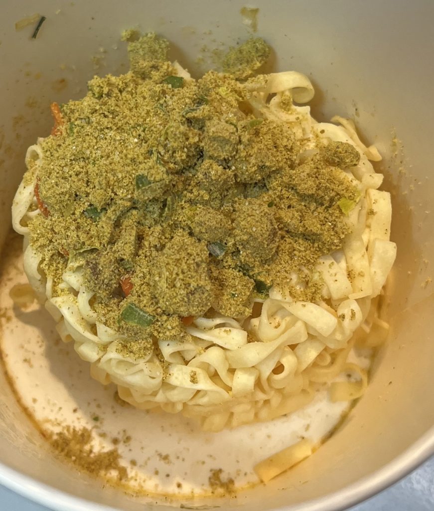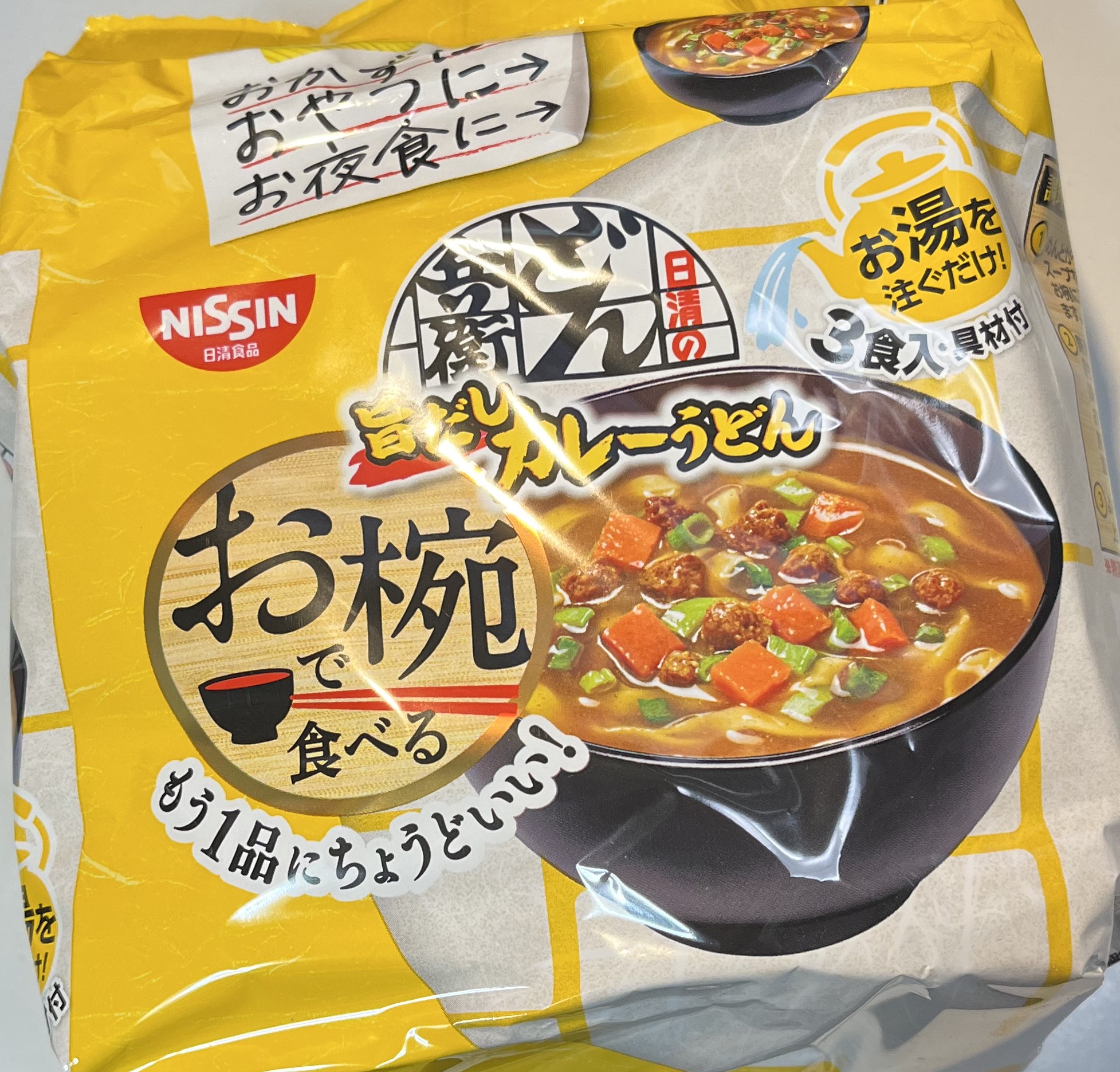●原材料名:油揚げめん(小麦粉(国内製造)、植物油脂、食塩、植物性たん白、卵粉、大豆食物繊維)、かやく入りスープ(糖類、カレー粉、味付肉そぼろ、にんじん、小麦粉、魚粉、ねぎ、酵母エキス、かつおぶし調味料、ビーフ調味料、こんぶ粉末、香辛料、たん白加水分解物)/加工でん粉、調味料(アミノ酸等)、増粘剤(加工でん粉、増粘多糖類)、リン酸塩(Na)、炭酸Ca、カラメル色素、香料、セルロース、酸化防止剤(ビタミンE、ローズマリー抽出物)、乳化剤、酸味料、香辛料抽出物、環状オリゴ糖、ビタミンB2、ビタミンB1、チャ抽出物、(一部に小麦・卵・乳成分・牛肉・さば・大豆・鶏肉・豚肉・ゼラチンを含む)