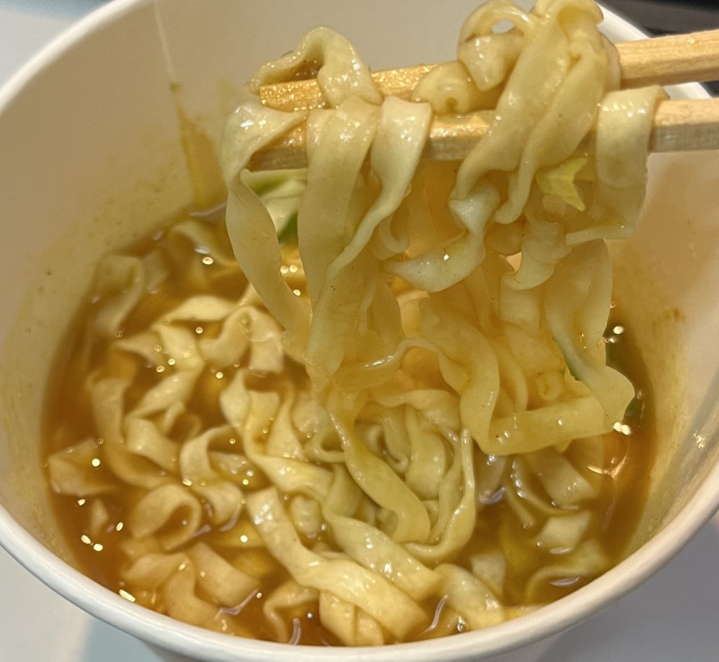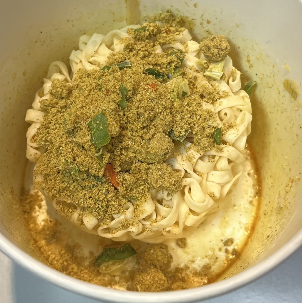 ●原材料名:油揚げめん(小麦粉(国内製造)、植物油脂、食塩、植物性たん白、卵粉、大豆食物繊維)、かやく入りスープ(糖類、カレー粉、味付肉そぼろ、にんじん、小麦粉、魚粉、ねぎ、酵母エキス、かつおぶし調味料、ビーフ調味料、こんぶ粉末、香辛料、たん白加水分解物、)/加工でん粉、増粘剤(加工でん粉、増粘多糖類)、調味料(アミノ酸等)、リン酸塩(Na)、炭酸Ca、カラメル色素、香料、セルロース、酸化防止剤(ビタミンE、ローズマリー抽出物)、乳化剤、酸味料、香辛料抽出物、チャ抽出物、ビタミンB2、ビタミンB1、(一部に小麦・卵・乳成分・牛肉・さば・大豆・鶏肉・豚肉・ゼラチンを含む)